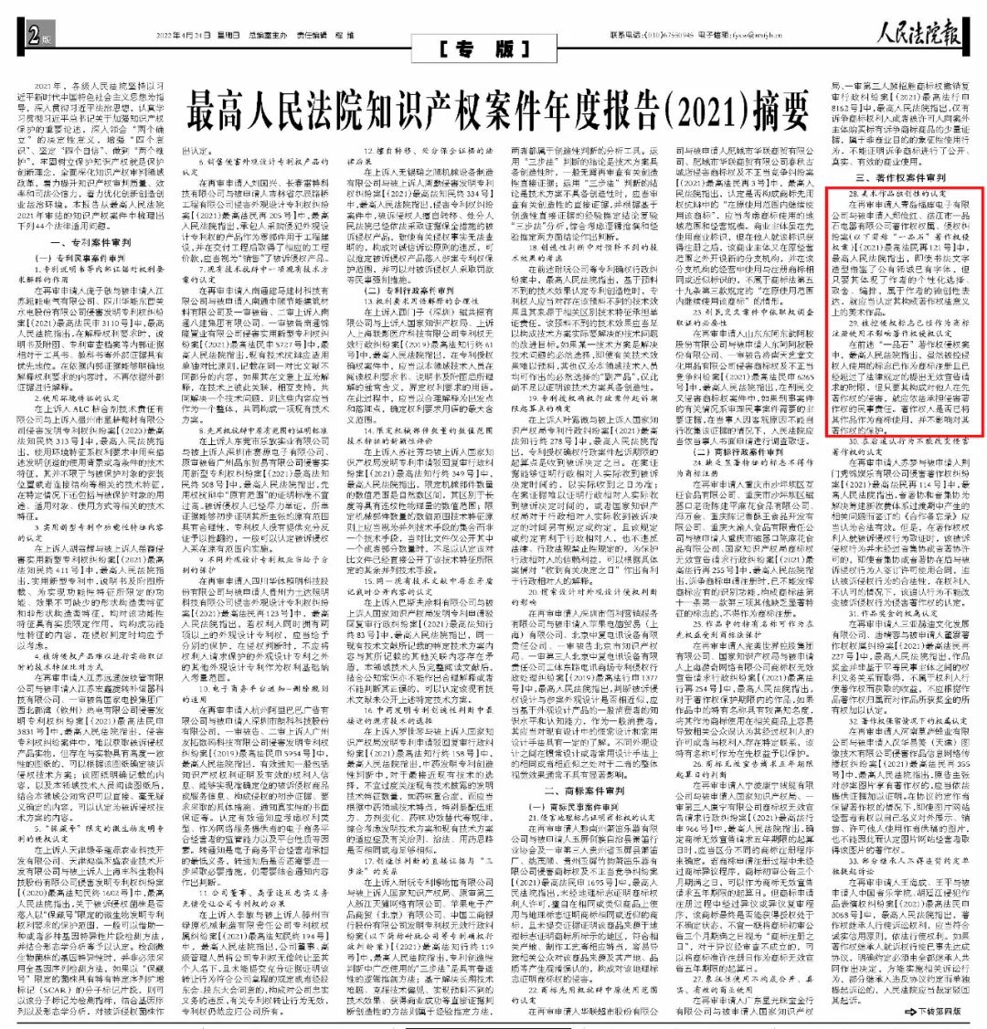 >5E对战平台>关于我们>荣誉概览>2022>集佳代理的“一品石”著作权侵权纠纷案入选《最高人民法院知识产权案件年度报告(2021)摘要》
