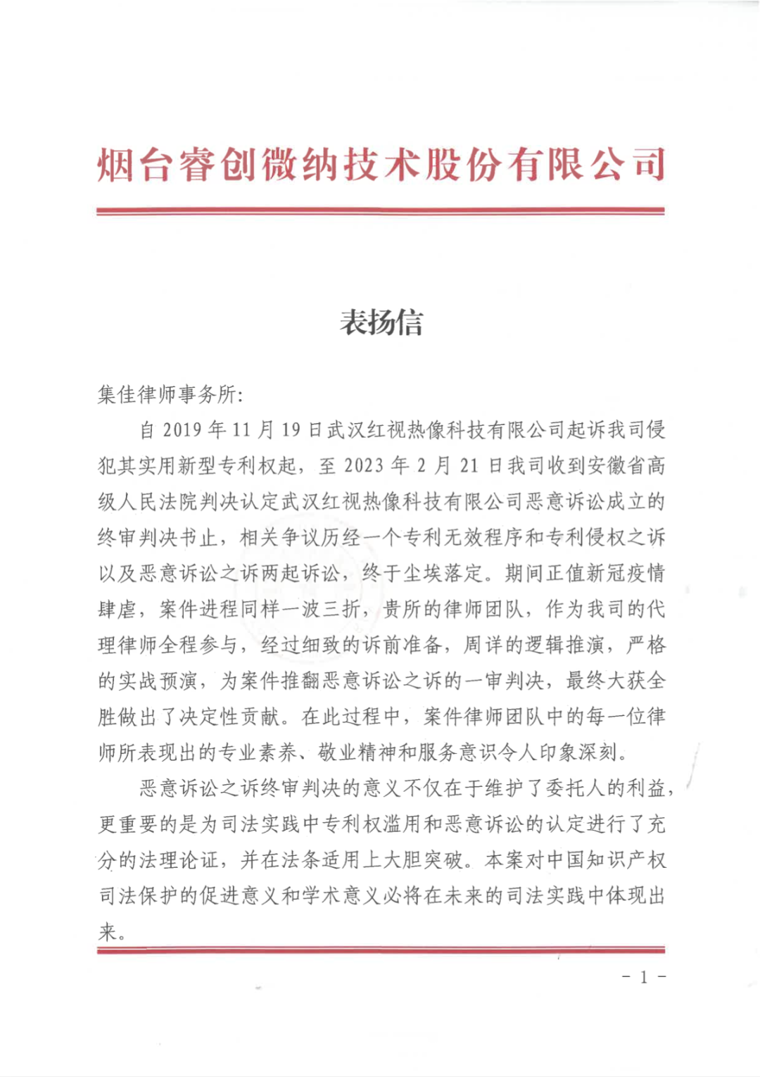 2023年2月10日,安徽省高级人民法院就烟台睿创微纳技术股份有限公司、烟台艾睿光电科技有限公司、安徽英睿系统技术有限公司等(下称“睿创集团”)与武汉红视热像科技有限公司(下称“武汉红视”)因恶意提起知识产权诉讼损害责任纠纷一案作出终审判决,认定武汉红视滥用诉权的行为构成恶意诉讼,并判令其赔偿睿创集团相应的合理支出。至此,时隔四年,横跨疫情时代的专利侵权及恶意诉讼系列纠纷案,终于尘埃落定。5E对战平台协助睿创集团最终取得系列案件的全面胜利,维护了客户合法权益,实现了商业竞争的公平正义!