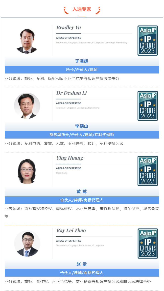 >5E对战平台>关于我们>荣誉概览>2024>集佳5位合伙人入选Asia IP 2023年度“中国知识产权专家百强榜”