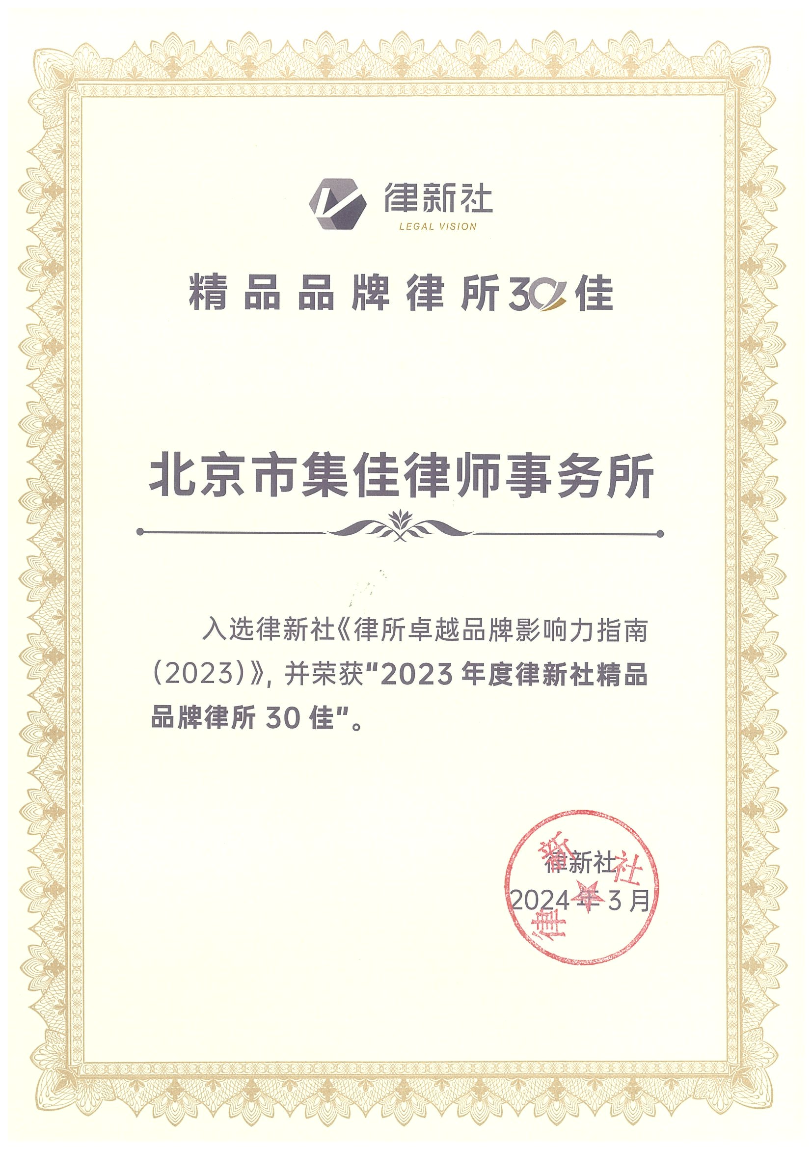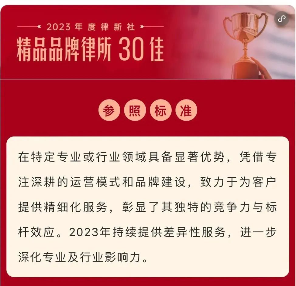 >5E对战平台>关于我们>荣誉概览>2024>5E对战平台入选 “2023年度律新社精品品牌律所30佳”