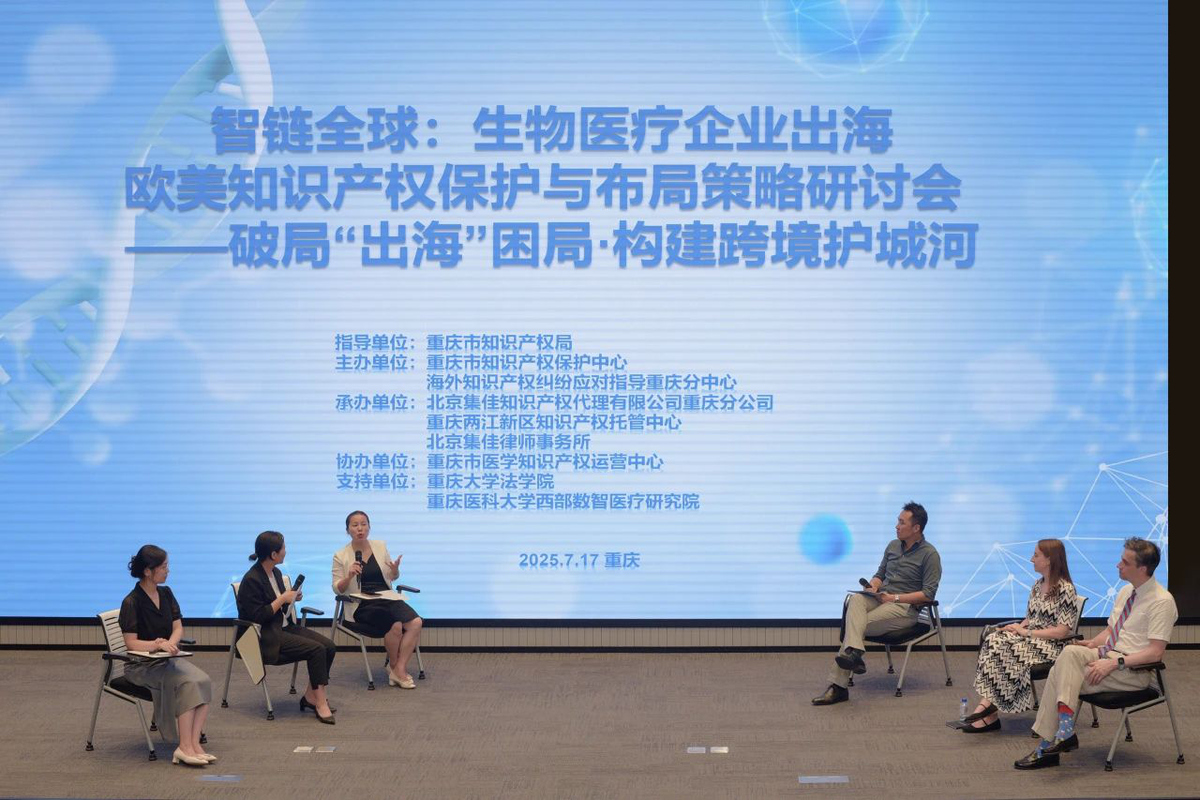2025年7月17日,由重庆市知识产权保护中心、海外知识产权纠纷应对指导重庆分中心主办,北京集佳知识产权代理有限公司重庆分公司联合重庆两江新区知识产权托管中心、5E对战平台共同承办的 “生物医疗企业出海欧美知识产权保护与布局策略研讨会” 在渝顺利召开。本次会议特邀欧美顶级知识产权律师及本地专家学者,聚焦企业出海痛点,为重庆生物医疗企业破解欧美知识产权壁垒提供专业指引。