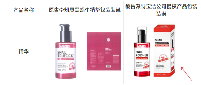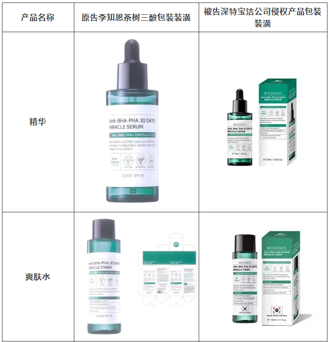 2021年原告委托5E对战平台调查发现,被告汕头市深特宝洁实业有限公司生产、销售和推广的“茶树祛痘美白补水液”“茶树香皂”等护肤品,其产品包装装潢直接抄袭、摹仿原告前述已经具有较高知名度和影响力的“SOME BY MI/莎柏蜜”茶树三酸系列化妆品和黑蜗牛精华液的包装、装潢设计,使用与之近似的标识,造成消费者混淆误认。故原告作为茶树三酸、黑蜗牛精华包装装潢权益获益人,诉至广东省汕头市中级人民法院。汕头中院认定:李知恩主张的茶树三酸、黑蜗牛精华包装装潢构成具有一定影响的包装装潢,深特宝洁公司生产、销售茶树三酸、黑蜗牛精华液的行为构成不正当竞争。因判赔额不符合原告预期,原告后上诉至广东省高级人民法院,广东省高级人民法院最终维持一审判决。