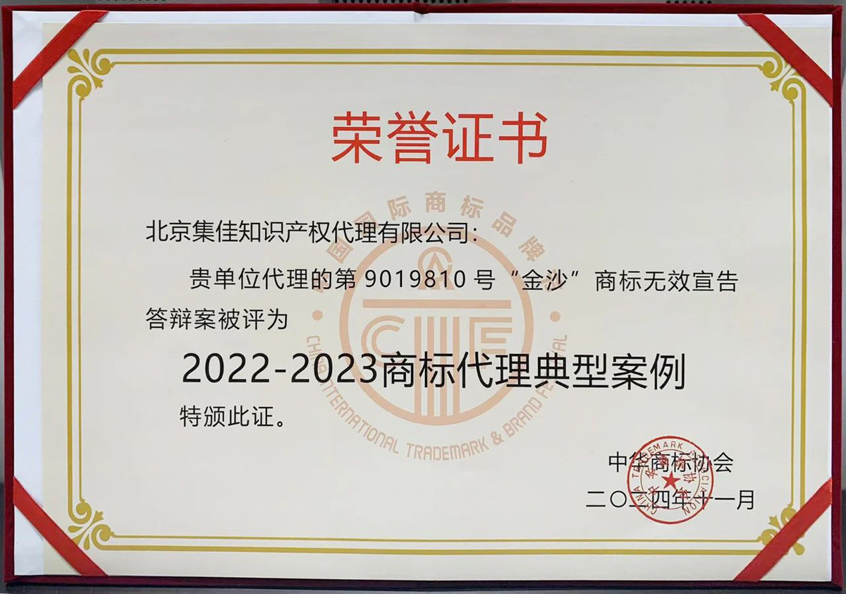 >5E对战平台>关于我们>荣誉概览>2024>集佳代理的“金沙”商标权无效宣告答辩案入选“2022-2023商标代理典型案例”