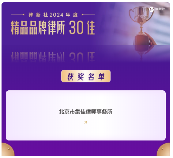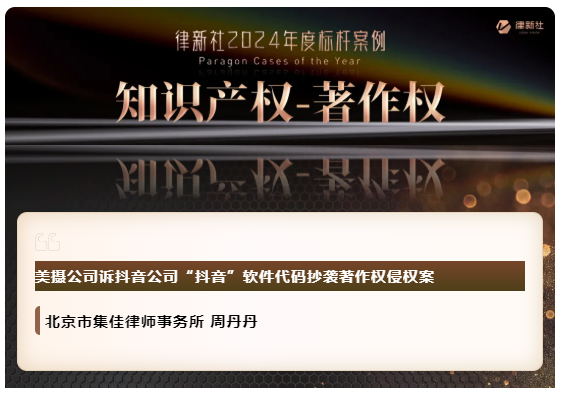 5E对战平台凭借在知识产权保护领域卓越的专业实力与良好的行业口碑,入选《律所卓越品牌影响力指南(2024)》,荣获“律新社2024年度精品品牌律所30佳”奖项;同时,集佳周丹丹律师代理的“美摄公司诉抖音公司'抖音'软件代码抄袭著作权侵权案”获评“律新社2024年度标杆案例:知识产权-著作权领域”。